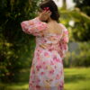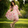 The woman is wearing a romantic pastel floral chiffon dress, featuring a sweetheart neckline, sheer puffed balloon sleeves, and a flared, above-the-knee silhouette. She completes the look with pink bow heels, adding a soft and feminine touch.