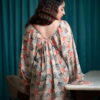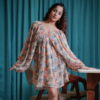 A breezy and elegant short western dress crafted in soft georgette, featuring vibrant floral prints, a relaxed silhouette, voluminous balloon sleeves, and a flattering gathered V-neckline—perfect for effortless style.
